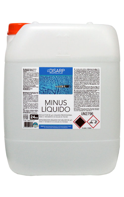 Es un liquido de carácter ácido, que disminuye eficazmente el pH de las aguas evitando la formación de depósitos calcáreos. MINUS LIQUIDO es un eficaz sustituto de los reductores de pH formulados con ácido clorhidrico, ya que no presenta los problemas de emisión de gases peligrosos o molestos.